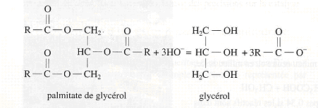Equation générale de l’hydrolyse basique d’un corps gras. Dans le cas du palmitate de glycérol, R = C15H31.